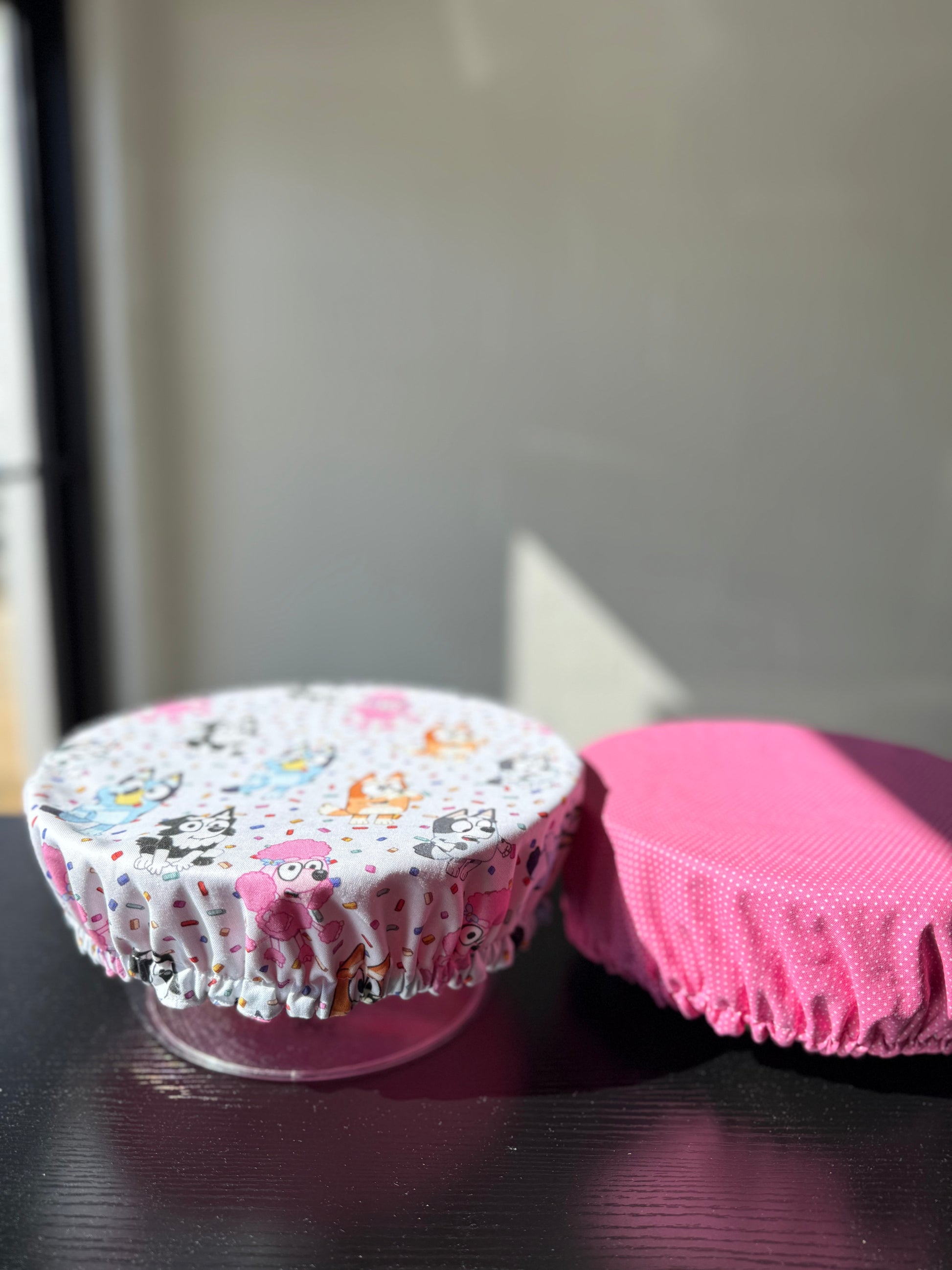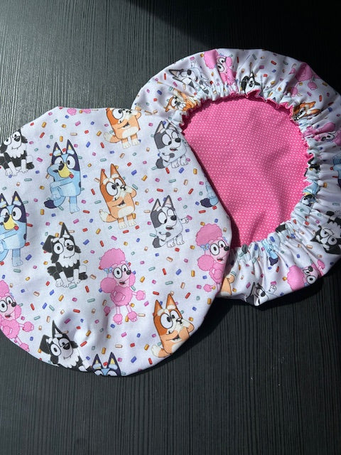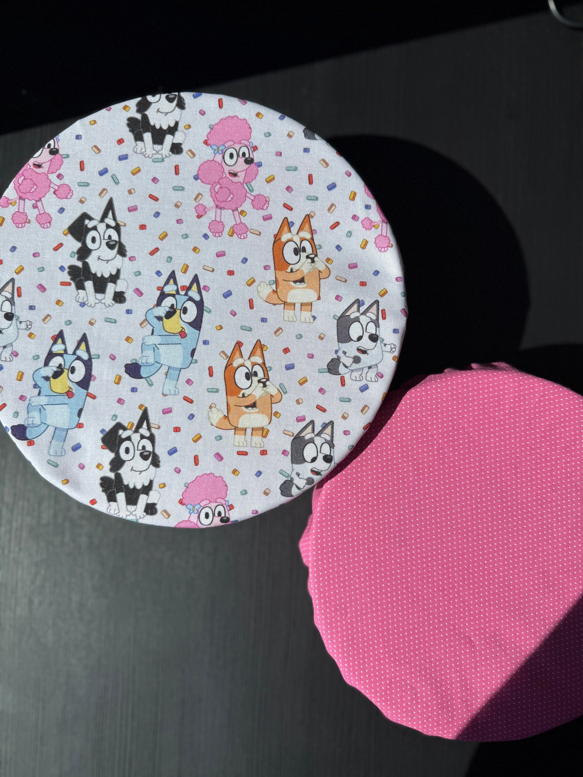 Bring a little fun to your sourdough routine with this handsewn reversible bowl cover featuring a playful Bluey and friends print with pink polka dots on the reverse side.
