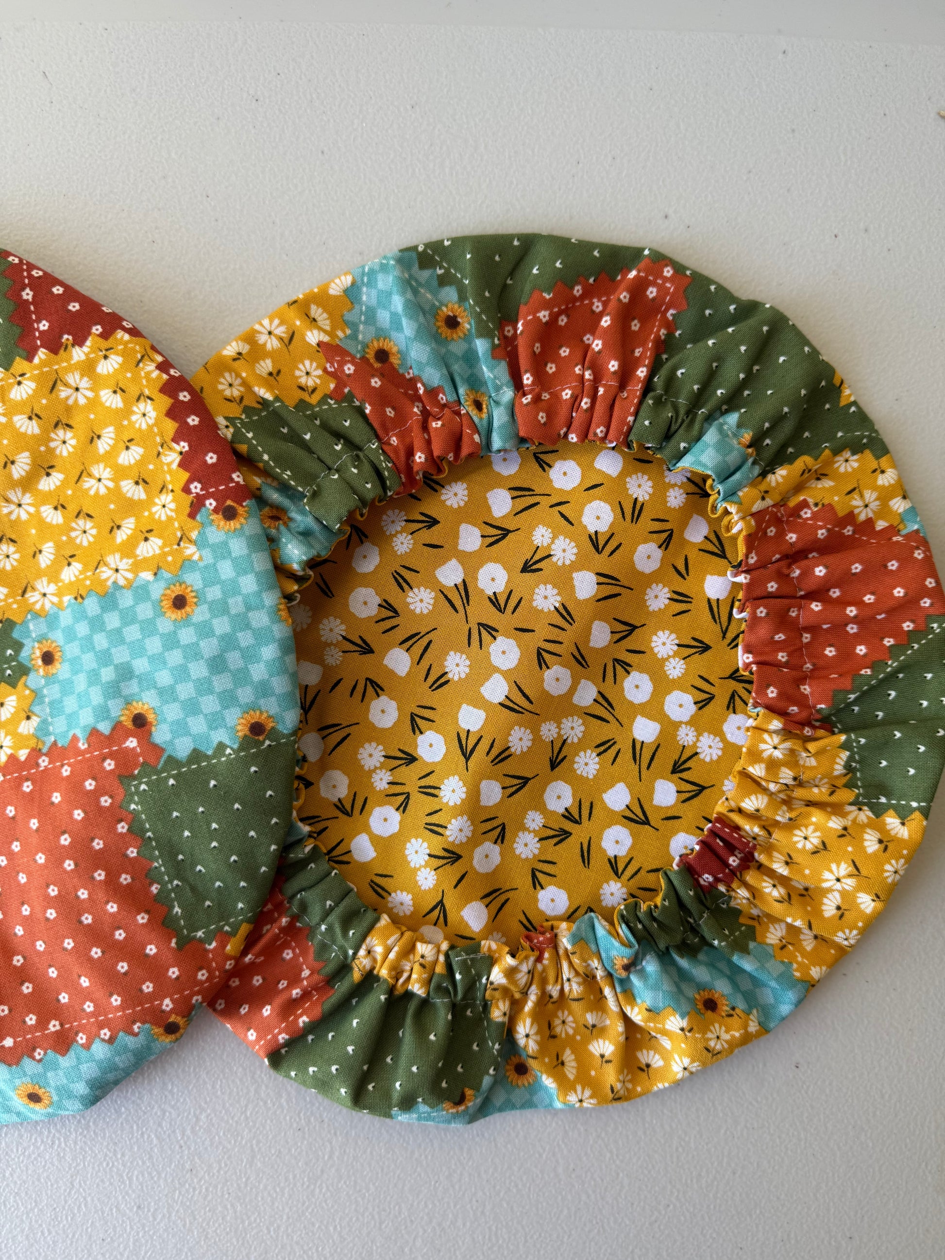 Swap plastic wrap for this hand-sewn, reversible cotton bowl cover. One side features cozy fall patchwork, the other a warm autumn floral print—two looks in one. Perfect for covering dough, salads, leftovers, or picnic dishes.