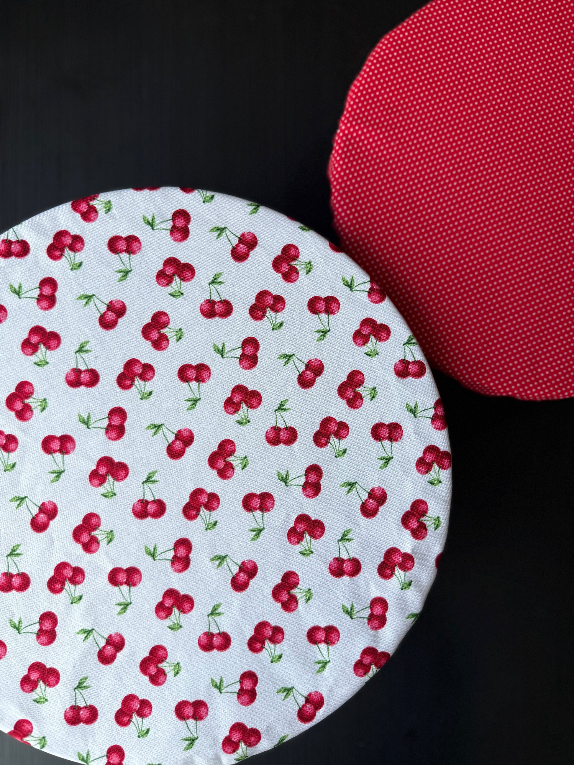 Bring a little joy into your kitchen with this sweet and timeless cherry + polka dot bowl cover 🍒