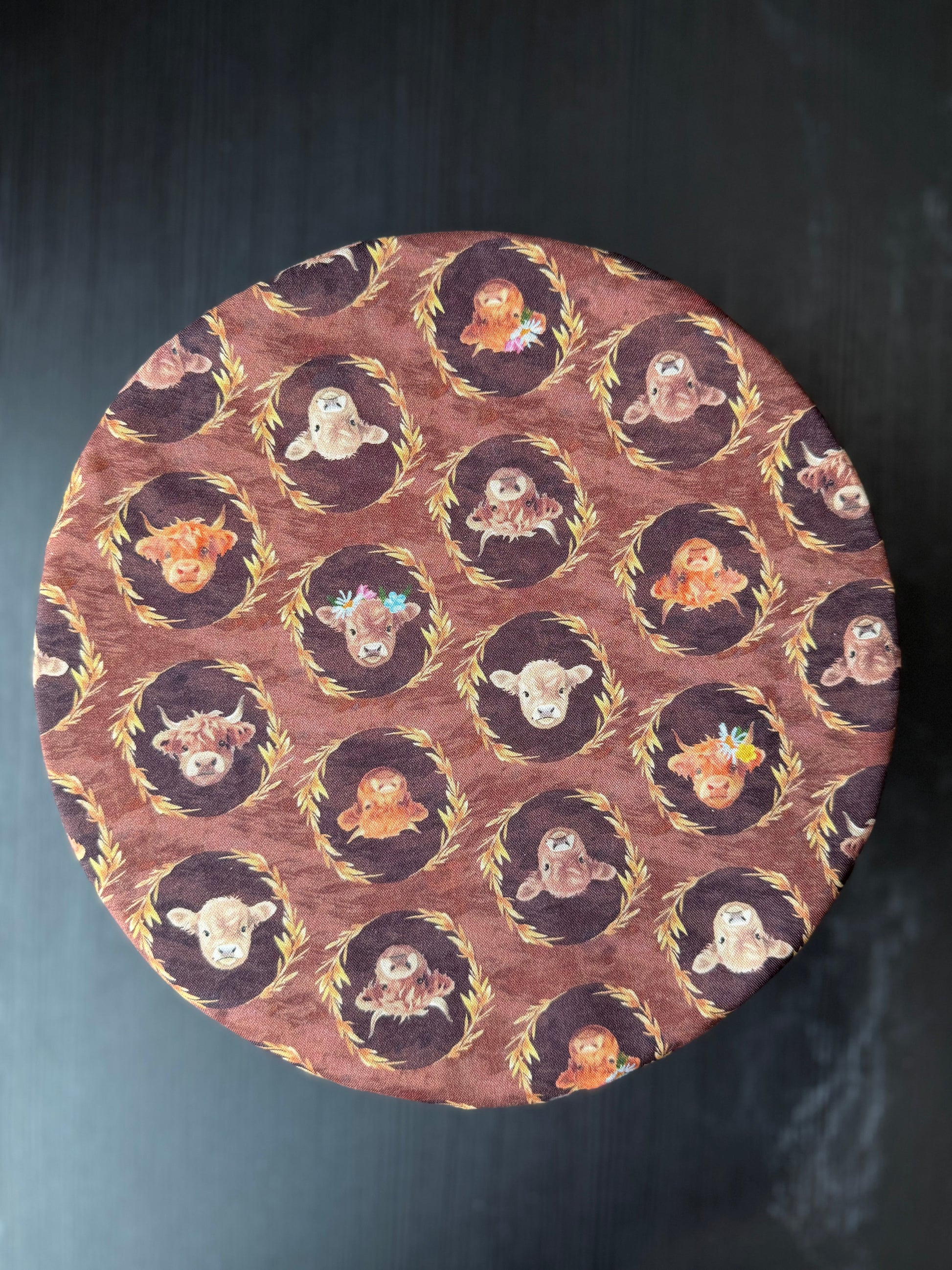 One reusable 100% cotton bowl cover in our Highland Hooves print