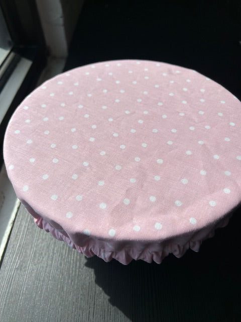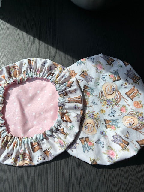 The Ranch Collection! This beautiful reversible bowl cover features a mix of cowboy boots, hats, flowers, and butterflies on one side, and soft pink with white polka dots on the other. It brings a fresh spring feel to your sourdough routine while keeping that cozy western touch.